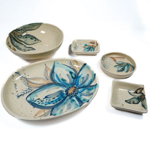 Product Description: A beautiful, limited edition ceramic set featuring unique hand-painted aqua and cream floral designs. Each piece is artistically crafted by skilled artisans, bringing a touch of elegance and exclusivity to your dining table. Perfect for everyday use or special occasions, this set combines artistry with functionality.