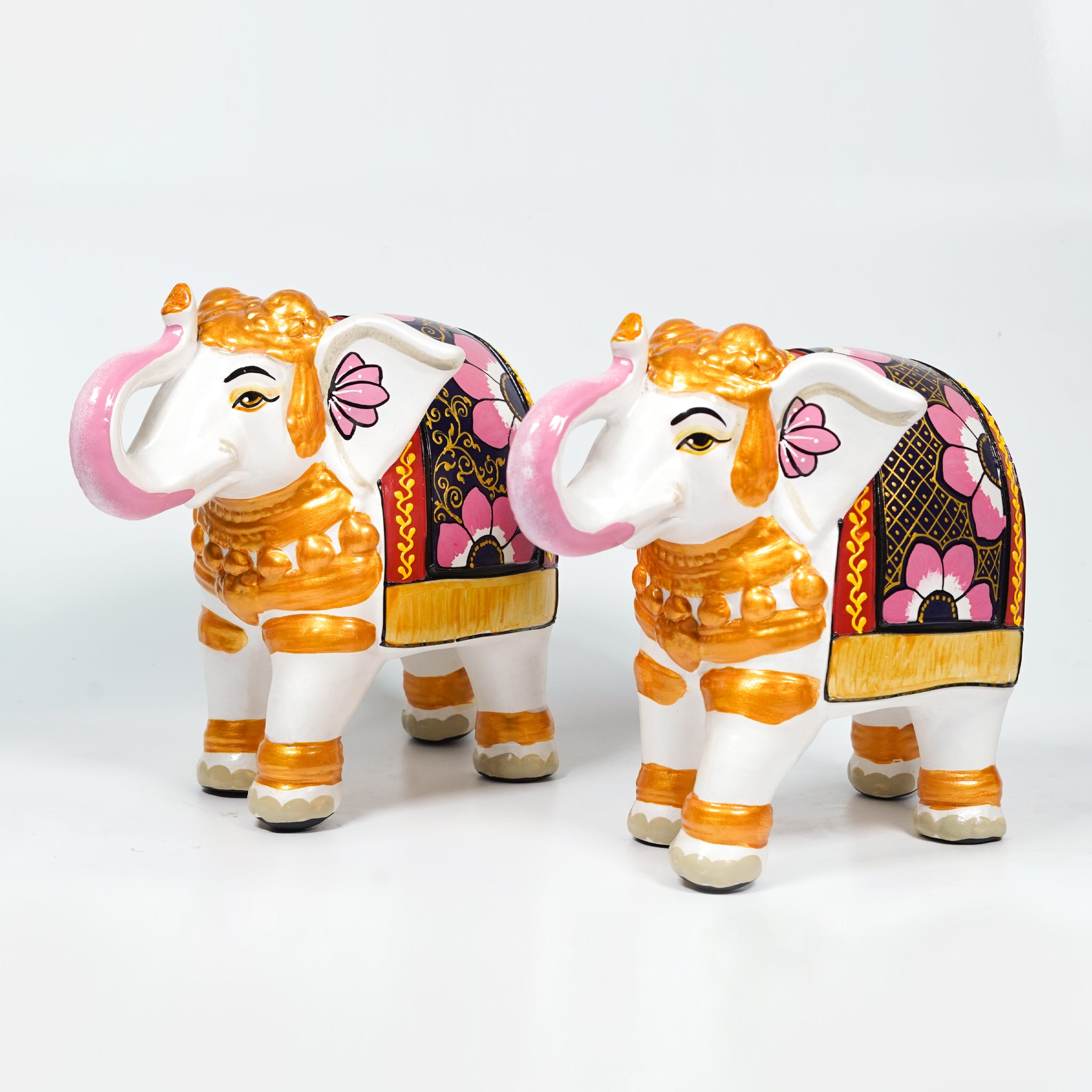 Product Description: These exquisite earthenware Elephant figurines exude the rich cultural heritage of India. Handcrafted with intricate detailing, these sculptures showcase the artistry and skill of Indian craftsmen. The vibrant colors and intricate patterns adorning the Elephant' bodies are a testament to the diverse artistic traditions of the subcontinent. These figurines make for a captivating addition to any home or office décor, serving as a window into India's vibrant cultural tapestry. Measuring approximately 19.5 cm in height, these earthenware sculptures are perfect for display on tabletops, or as part of a curated collection. Embrace the essence of Indian craftsmanship with these stunning Elephant figurines.
