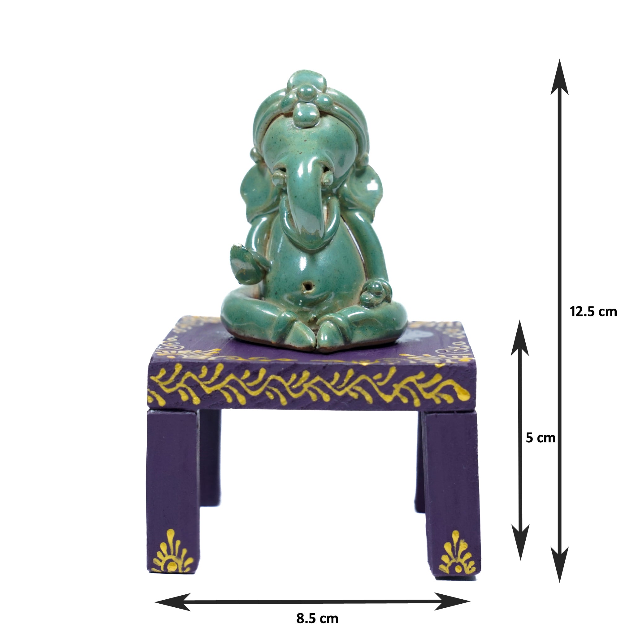 This handcrafted miniature Ganesh idol is made from high-temperature ceramic, placed beautifully on a wooden stand for an elegant display. Its detailed handwork and smooth finish make it a perfect piece for your home décor, puja space, or as a thoughtful gift.