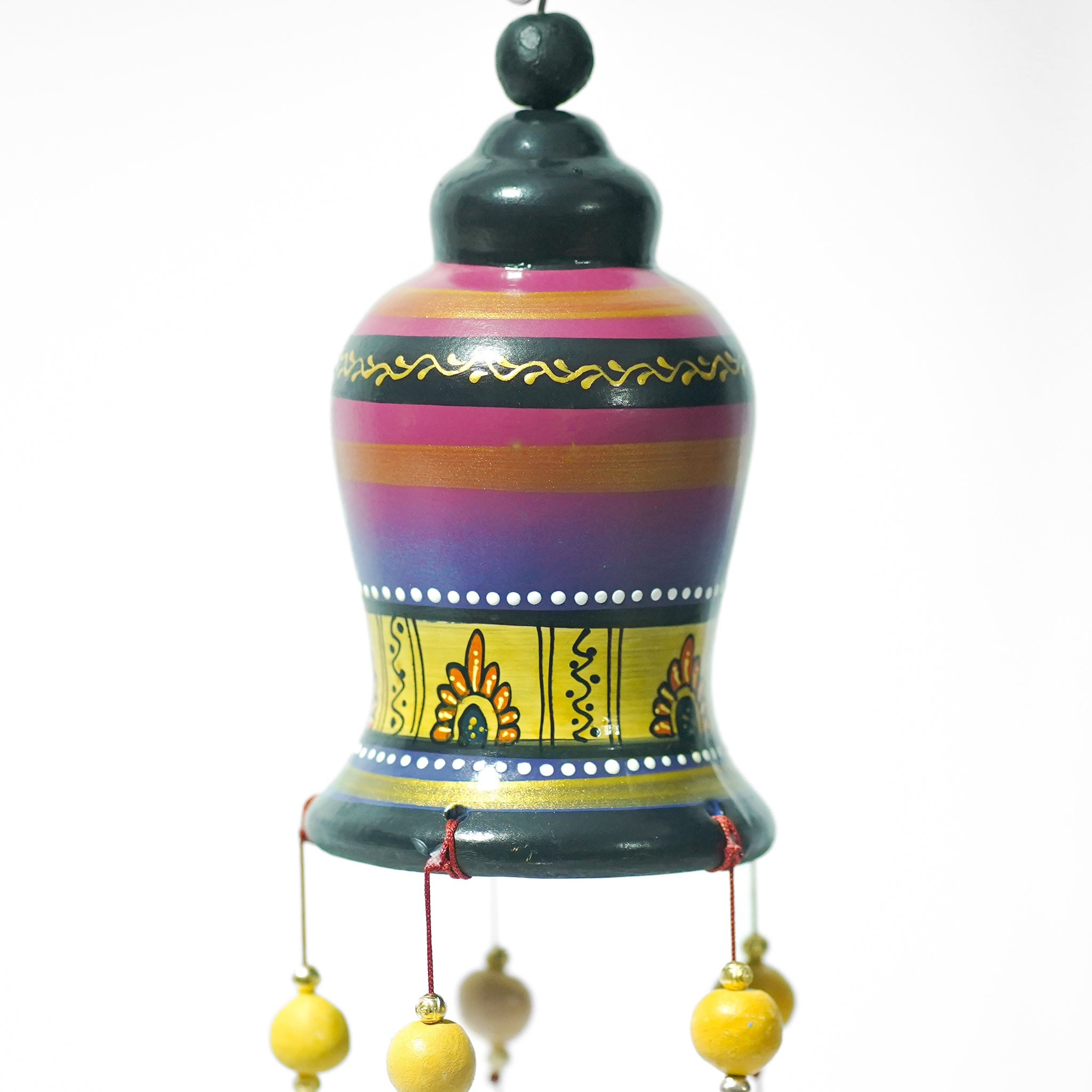 Product Description: Colorful: It features a vibrant color scheme with black, purple, yellow, red, and white. Ornate: The top of the bell has a decorative design with patterns and colors. Hanging Bells: Several small bells are attached to the bottom.