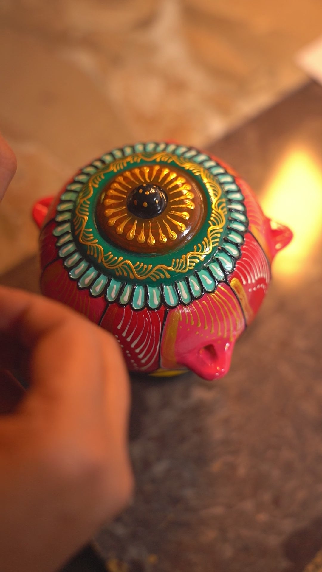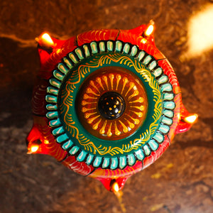 Product Description: Hand painted Design , This Agal for Oil Insert for bottom holes then Rotating before Rotating opposite holes Close then rotate , Unique Model, Five Face Diya.