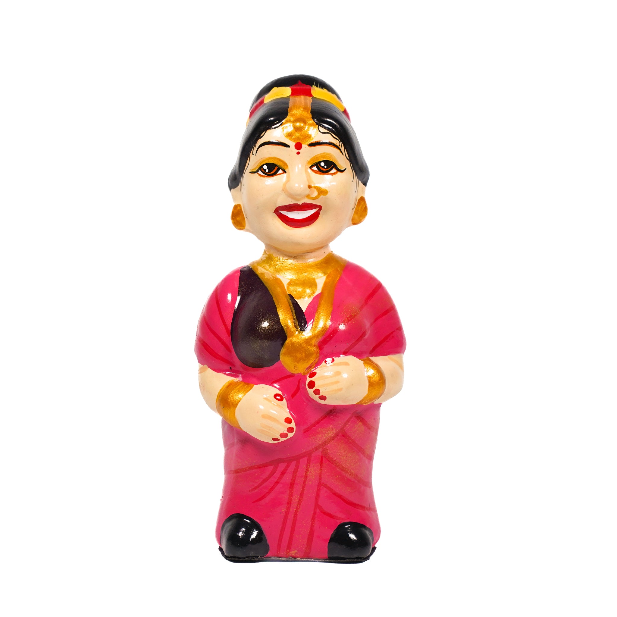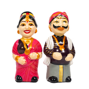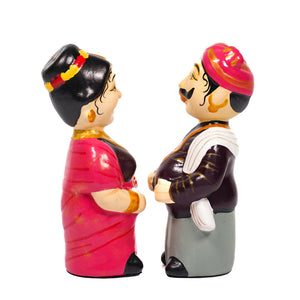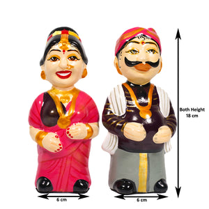 Product Description: This "Mummy Daddy Set Home Decor" features a pair of brightly painted traditional Indian dolls. The style is reminiscent of the famous Thanjavur Thalayatti Bommai (Tanjore bobble-head dolls) or Raja Rani Bommai (King and Queen dolls) from Tamil Nadu, India. The depiction of a king and queen is very common, symbolizing royalty, tradition, and auspiciousness. They are often used in Golu (or Kolu) displays during the Navaratri festival in South India, representing various deities, figures from mythology, and scenes from everyday life.