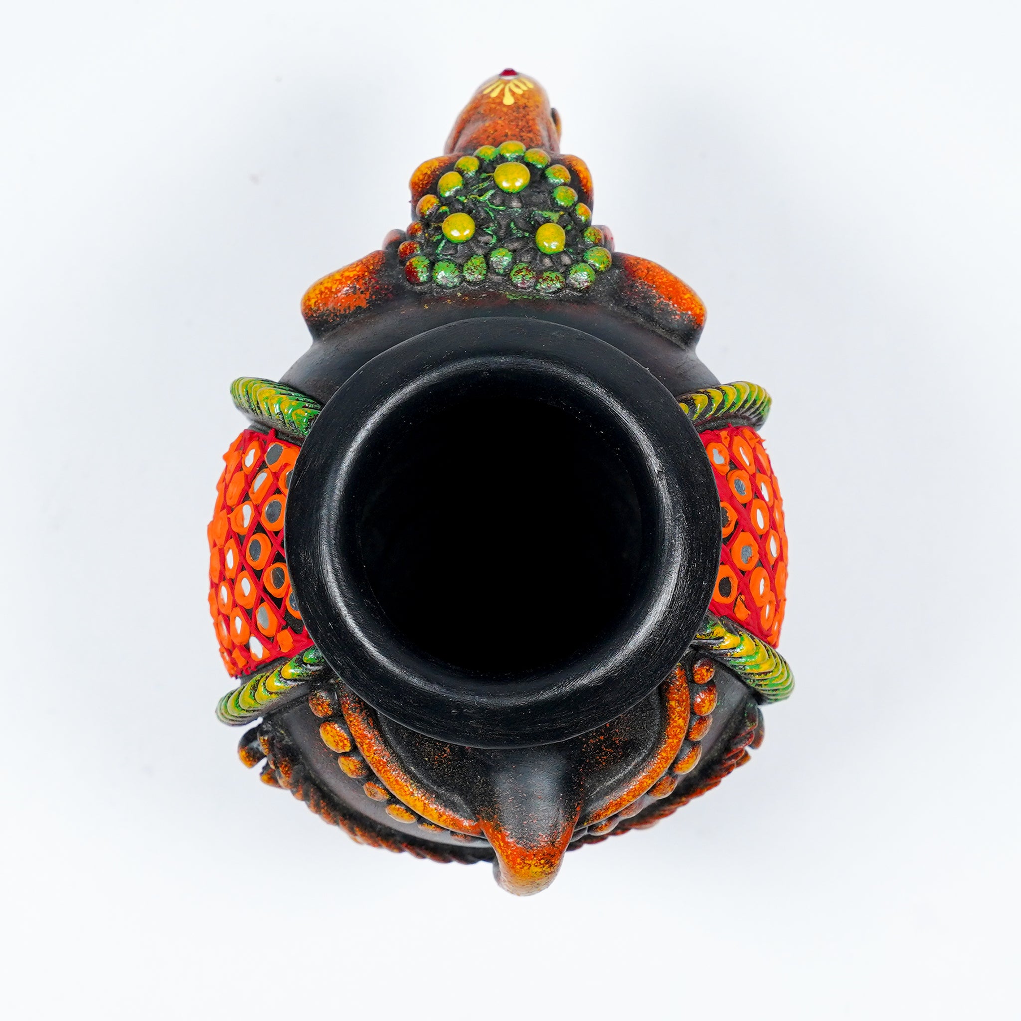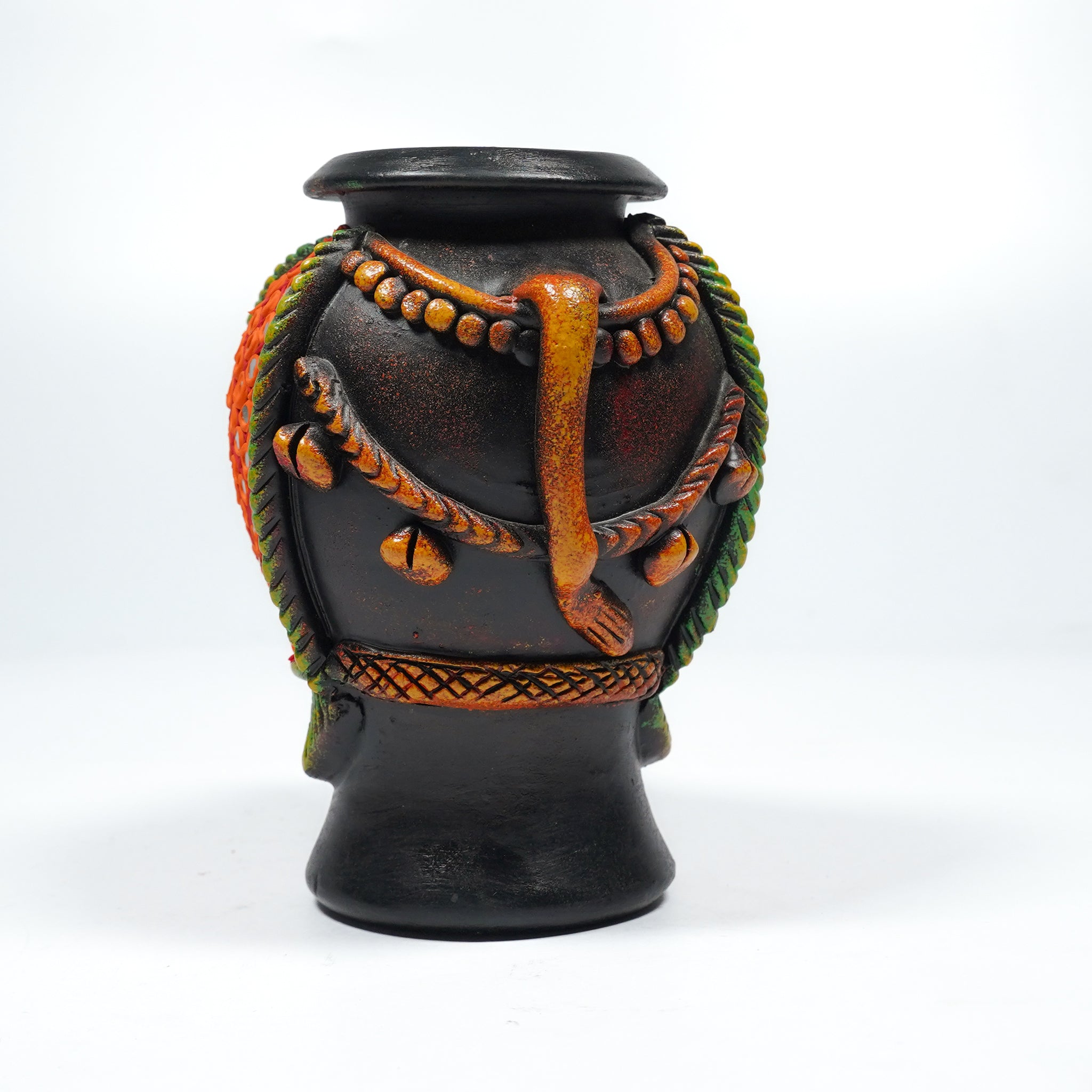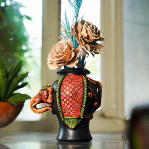 This handcrafted terracotta flower vase is made from fired clay, giving it a natural earthy color and texture. The intricate design is carefully created by hand, reflecting skilled craftsmanship. Its elegant shape, featuring a wide body with a narrower neck, is thoughtfully designed to hold and display flowers beautifully, making it a perfect piece for both décor and daily use.