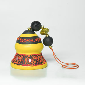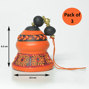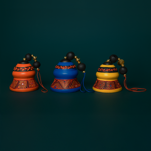 Product Description: Add a vibrant touch to your space with this set of three miniature ceramic bells, each uniquely hand-painted in bright hues of orange, blue, and yellow. Featuring intricate traditional Indian motifs and accented with decorative beads, these bells are perfect as wall hangings, shelf accents, or thoughtful gifts. Compact and eye-catching, they bring a splash of color and cultural charm to any corner of your home.