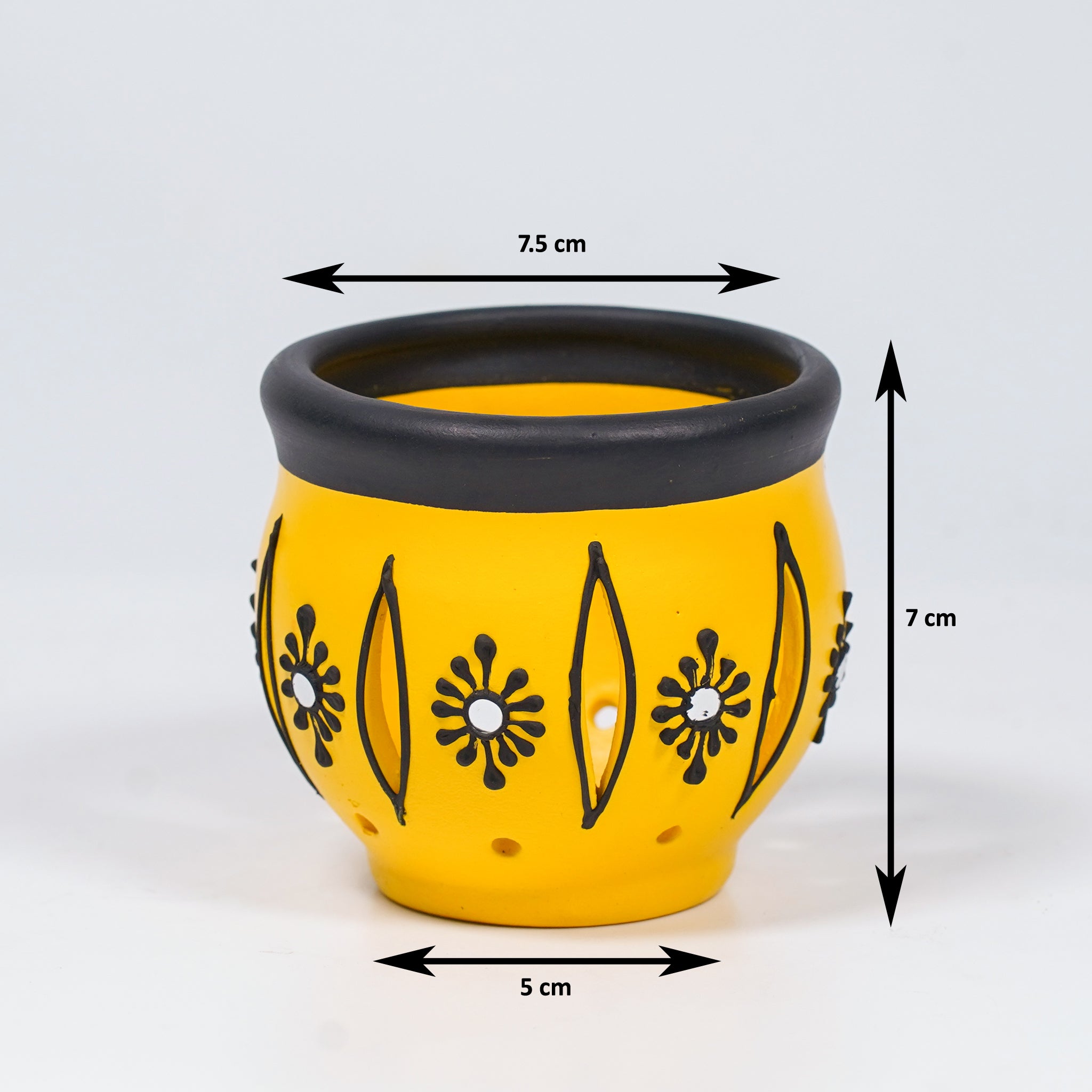 Product Description: The texture and appearance of the pot, especially the way the paint sits on it, it's made from earthenware (like terracotta or a similar fired clay).The small holes visible at the bottom and the overall pot shape are typical for holding a small 'tea light' candle, allowing the light to emanate through the decorative cutouts.
