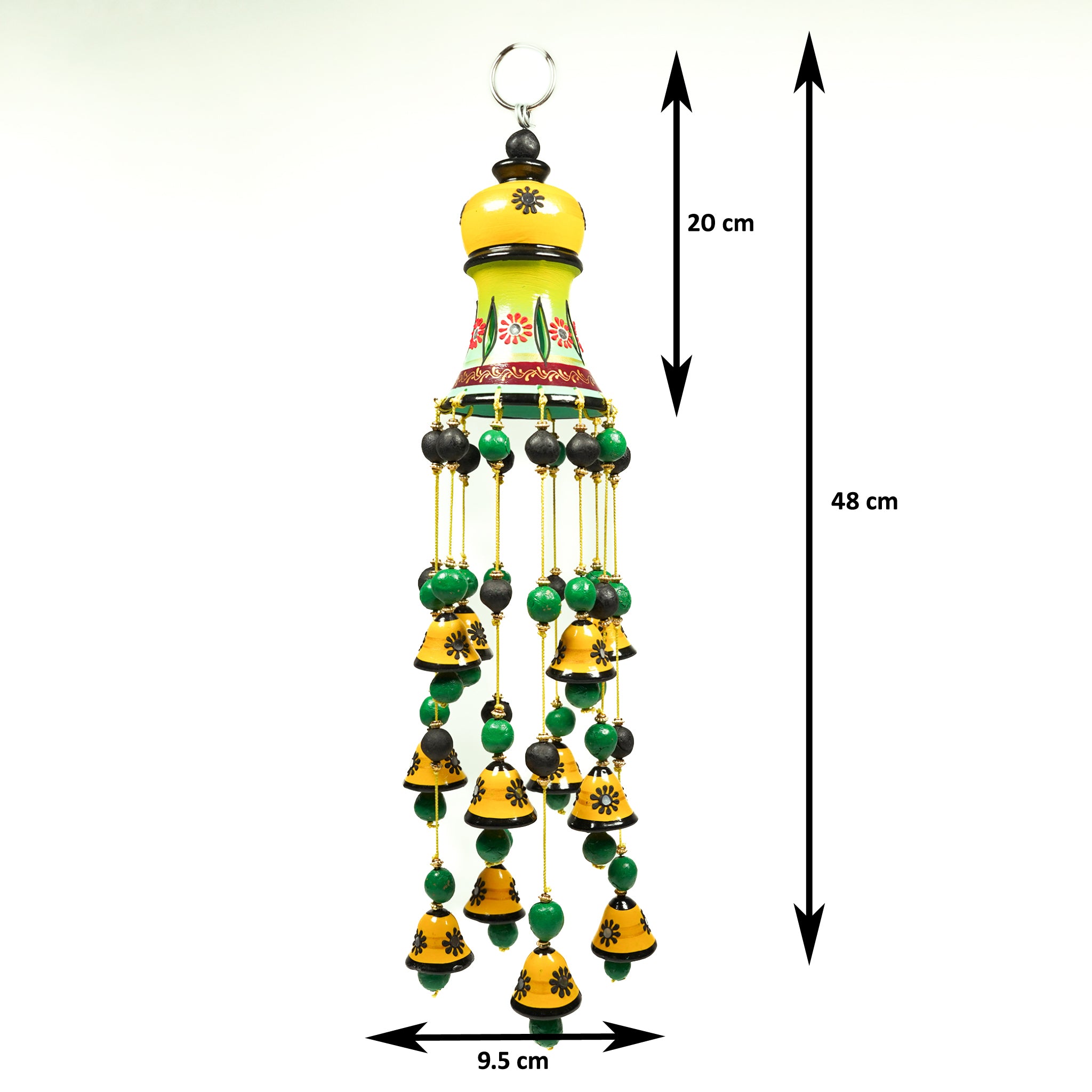 This handcrafted terracotta hanging bell is made from durable earthenware clay and features a full hand-painted design. It is beautifully strung with nylon rope and accented with terracotta beads, adding a rustic yet artistic charm. Perfect for semi-shaded indoor spaces, it brings an ethnic and aesthetic appeal to your home décor.